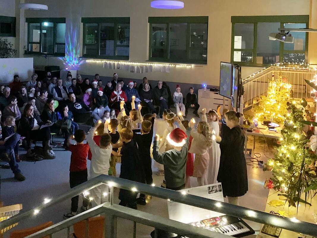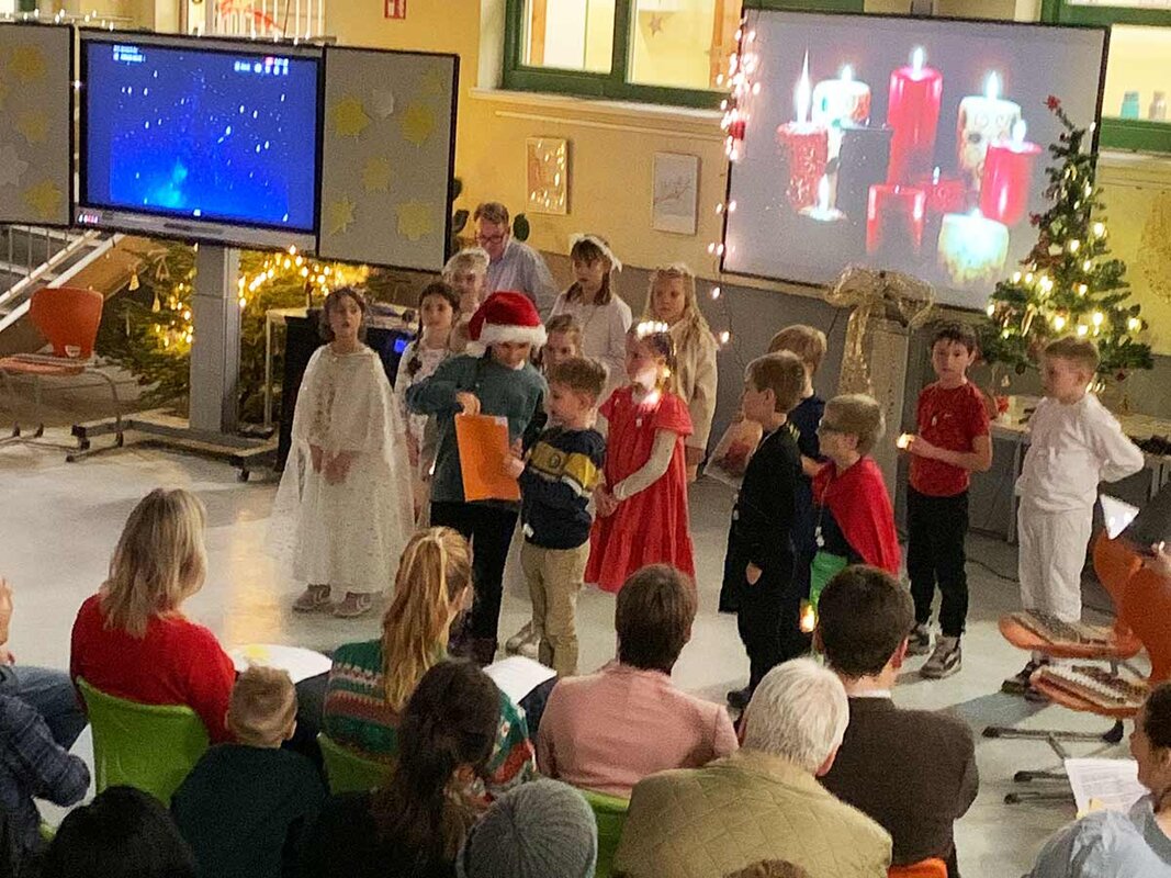 Nach der freundlichen Begrüßung durch Lotta, Aaron und Feline zog die Klasse mit leuchtenden Kerzen ein. Begleitet wurde dieser stimmungsvolle Moment vom Lied „Kommt, wir zünden Kerzen an!“, dass sofort für weihnachtliche Stimmung sorgte.