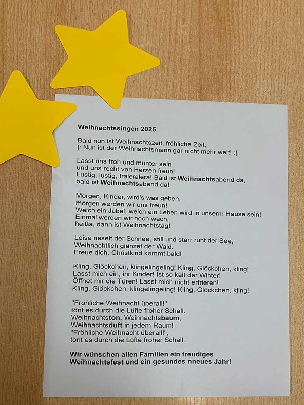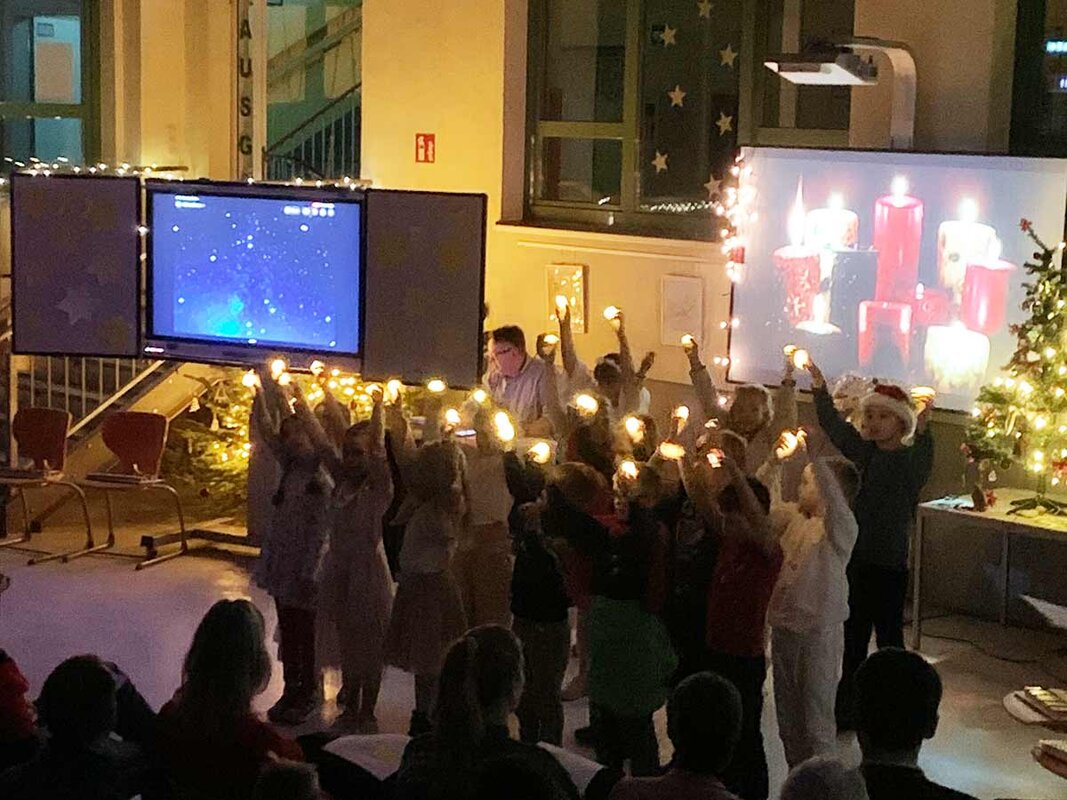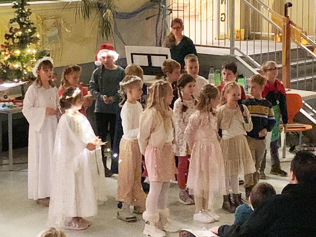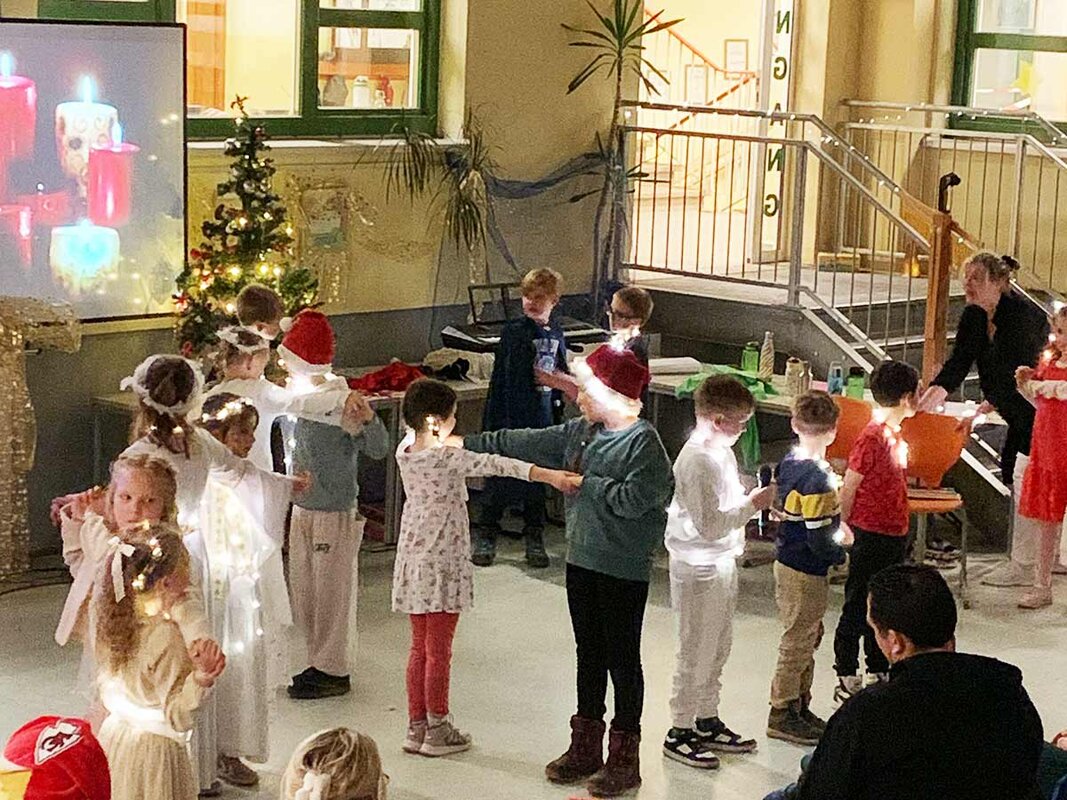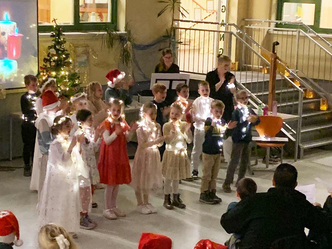 Im weiteren Verlauf trugen die Kinder verschiedene Gedichte vor und sangen festliche Weihnachtslieder. Ein besonderer Höhepunkt war der bezaubernde Lichtertanz der Klasse, der das Publikum sichtbar begeisterte. Dass die Klasse 2a auch modern kann, bewiesen die Kinder eindrucksvoll mit einem Rap, der für überraschte und lachende Gesichter sorgte.